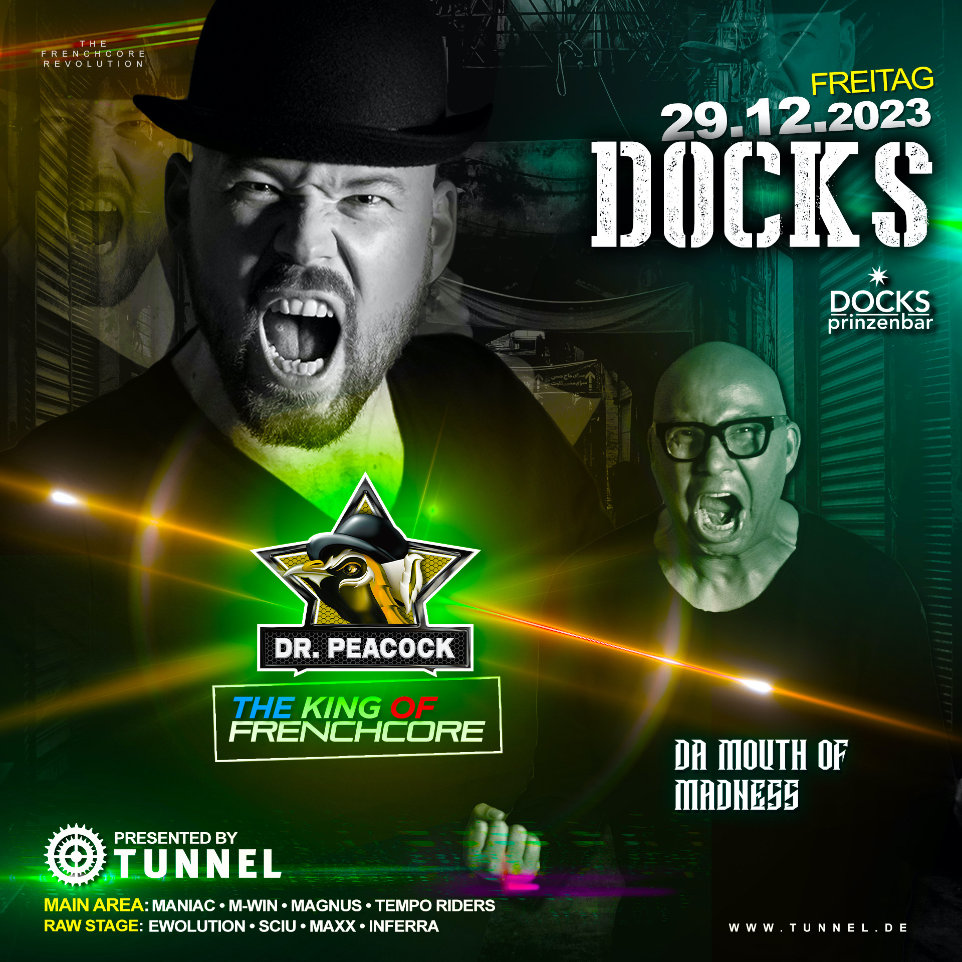 DR. PEACOCK „The One And Only Frenchcore Preacher“ in the House und das natürlich nicht allein: DA MOUTH OF MADNESS, des Doktor´s geniale Stimme auf allen Festivals dieser Welt, kommt ebenso mit ins DOCKS und wird uns zwischen den Tagen den perfekten Abflug besorgen! Support gibt´s u.a. von MANIAC, MAGNUS, M-WIN und den TEMPO RIDERS!